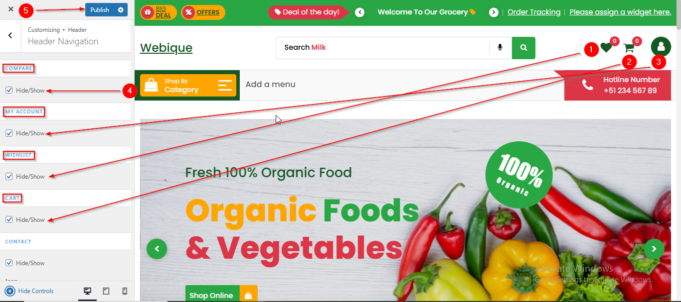 - Here, you can manage the Header Navigation Icons such as COMPARE , MY ACCOUNT , WISHLIST & CART by enabling or disabling them using the Hide/Show checkbox.