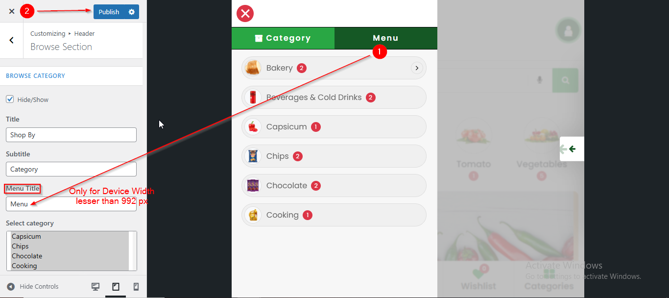 To manage the Browse Category Menu and Product Search in Header Section, follow these steps: