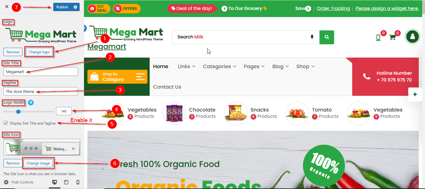 - Here, you can manage the Logo, Site Title , Tagline , Logo Width and Site Icon.
