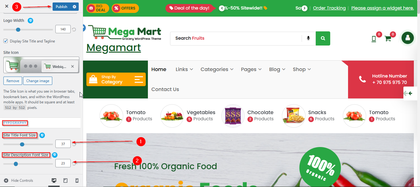 - For the Site Title and Description, scroll to the TYPOGRAPHY section below the Site Icon, where you can adjust the Font Size.