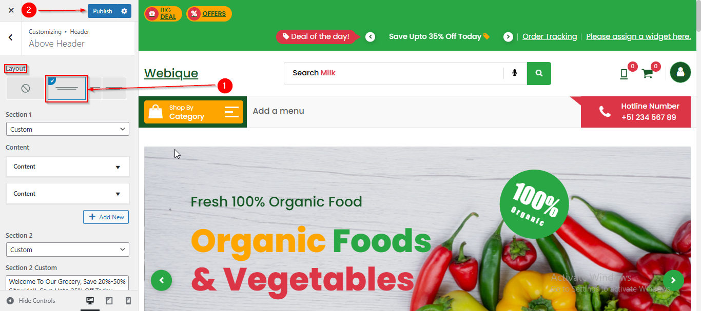 To manage the Above Header Layout in the Header Section, follow these steps:
