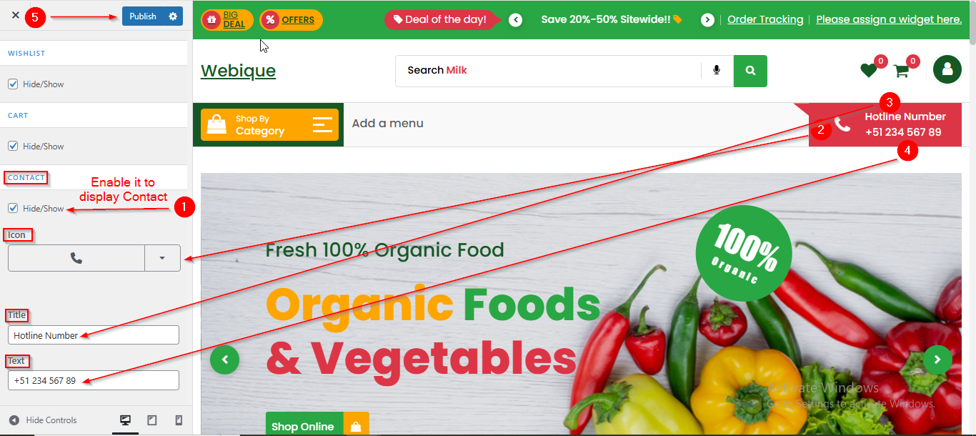 To manage the Contact Widget Area in Header Navigation in Header Section, follow these steps: