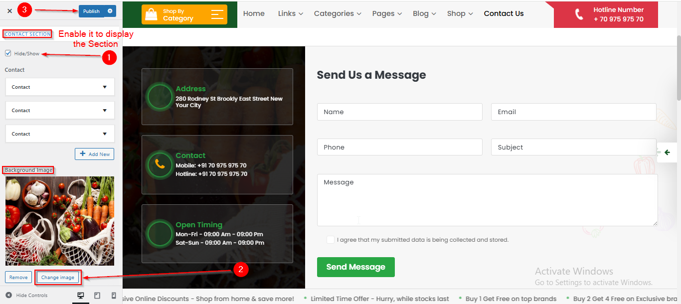 To manage the Background Image in Contact Section, follow these steps: