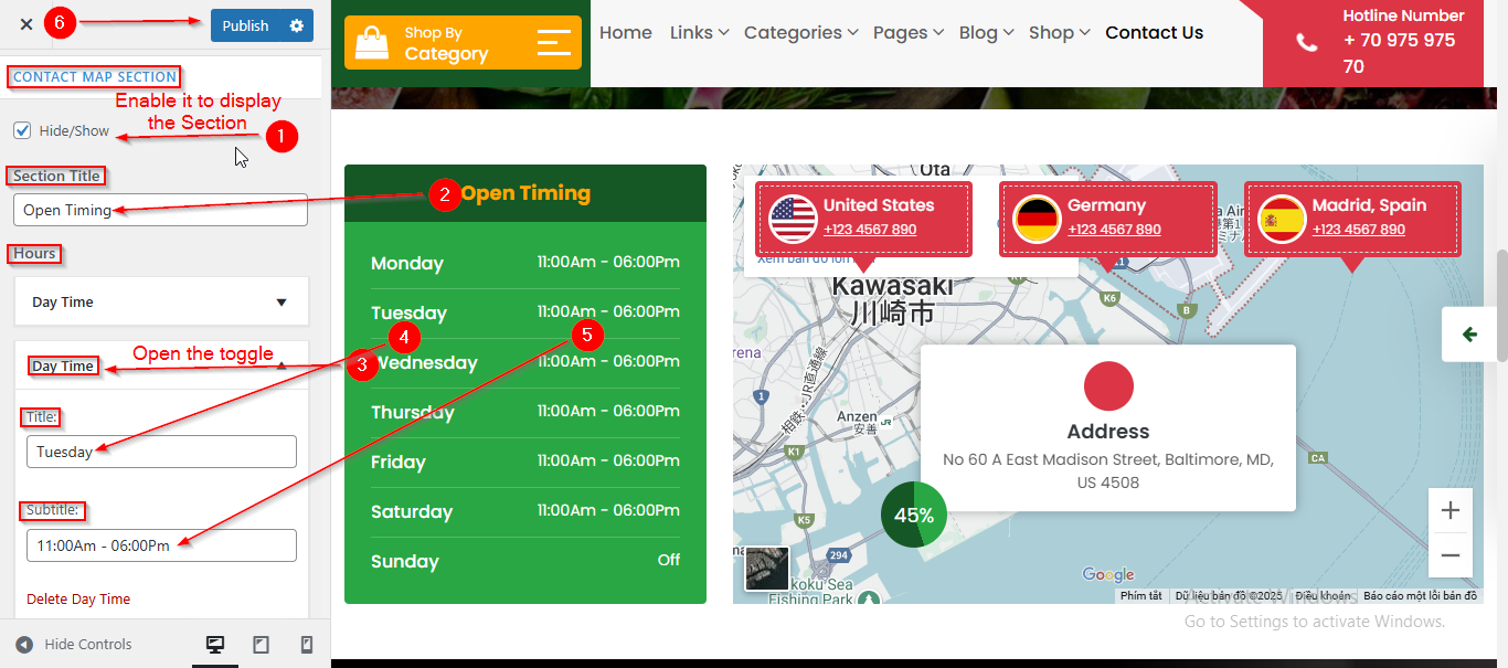 To manage the Office Timing Content in Contact Map Section, follow these steps: