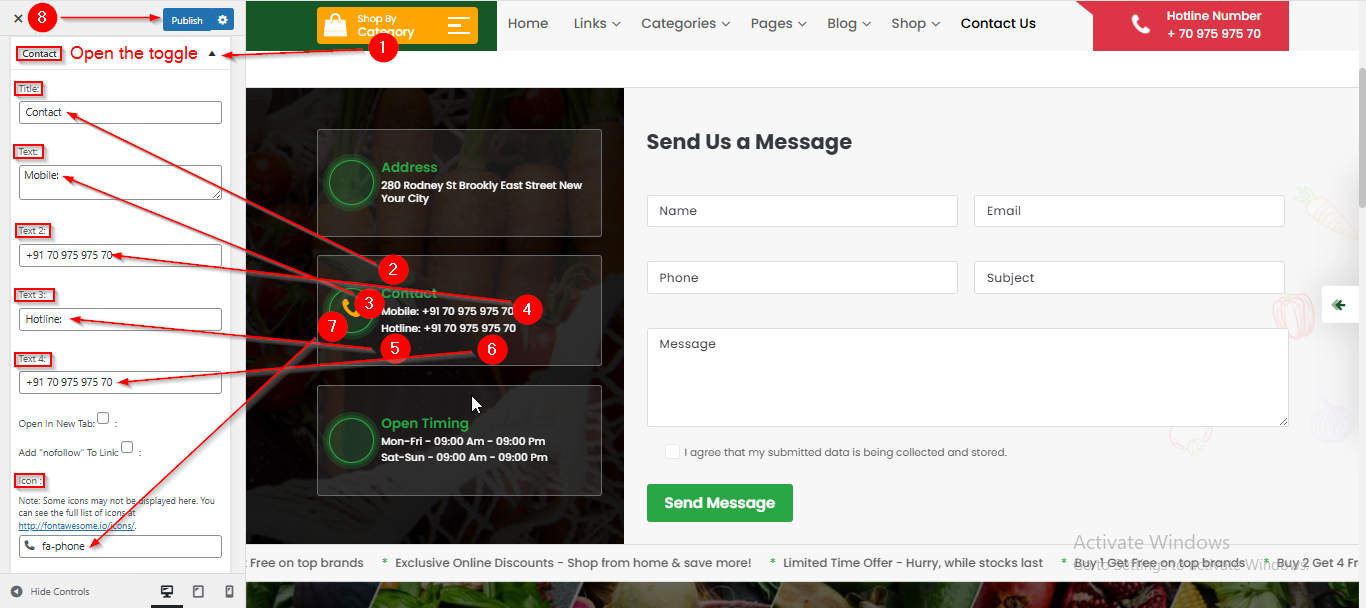 - Open the Contact toggle to manage the Contact Content such as Title , Text , Text 2 , Text 3 , Text 4 & Icon.