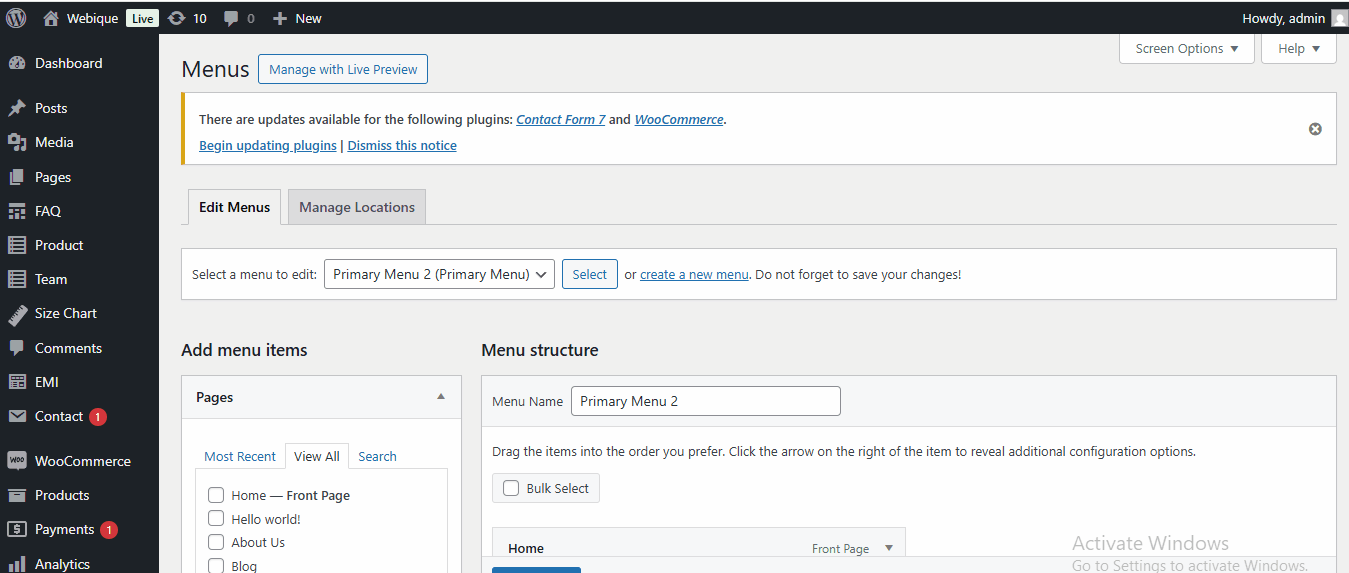 - On the Menus page, you will find various options for managing your menus. We will discuss these options in detail below.