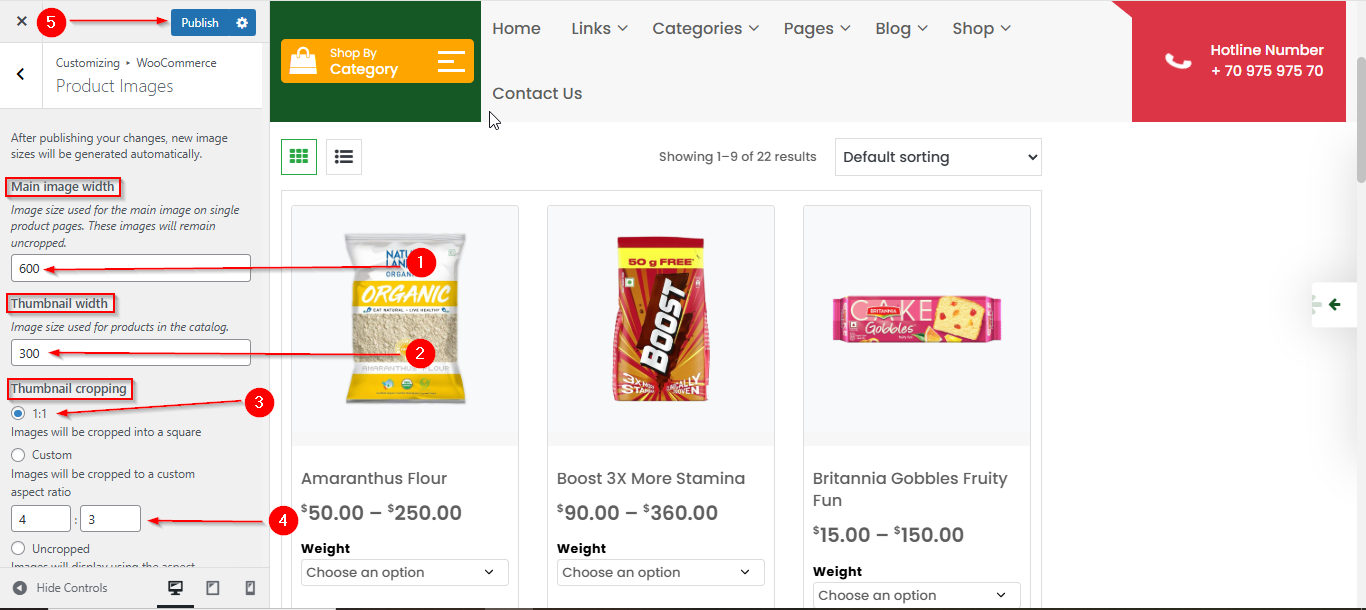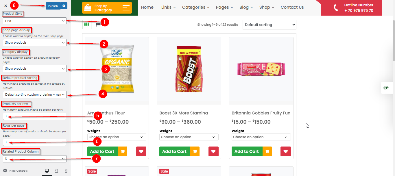 - Here, you can manage various Product Settings such as Product Style selection, what to display on the Shop Page, what to show on the Product Category Page, how products should be sorted, Products per row, Rows per page and Related Product Column.