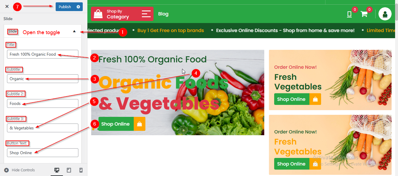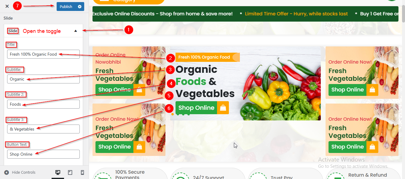 - Here, open the Slide toggle to manage the Slide title, Subtitle , Subtitle 2 , Subtitle 3 and Button Text.