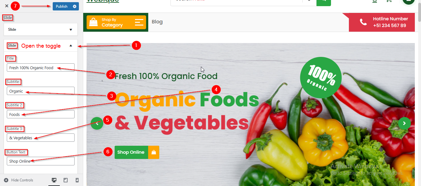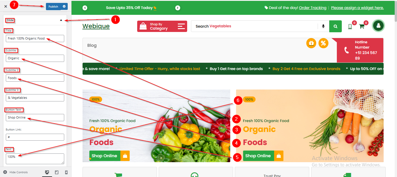To manage the Slide title, Subtitle , Subtitle 2 , Subtitle 3 , Button Text and % Text in Slider Section, follow these steps: