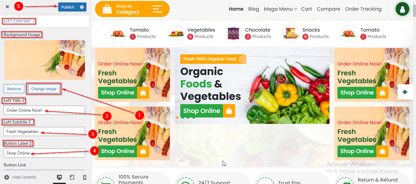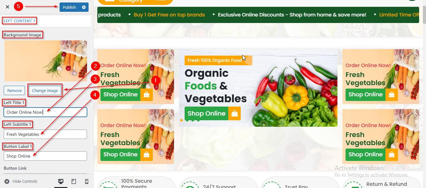 - From here you can manage the Left 1 Content such as Background Image , Left Title , Left Subtitle and Button Label.
