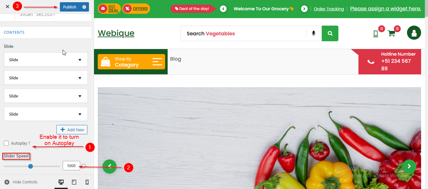To manage the Slider Autoplay and Slider Speed in Slider Section, follow these steps: