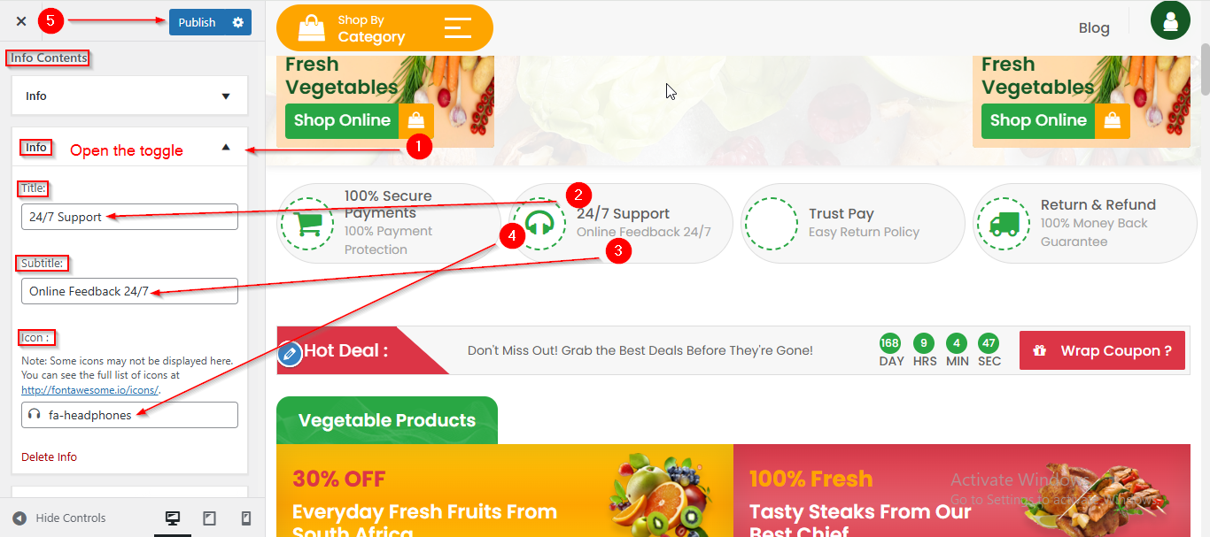 - Open the Info toggle to manage the content such as Title , Subtitle and Icon.