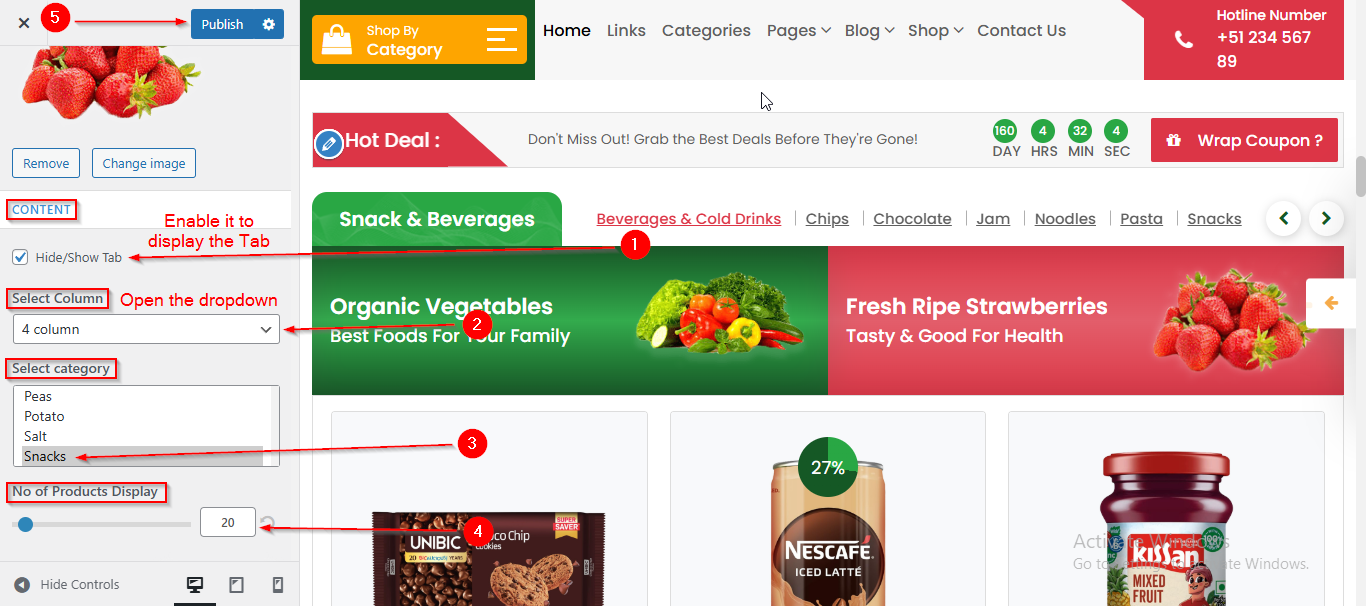 To manage the Filter Tab , Select Column , Select Category and No. of product display in Product One Section, follow these steps: