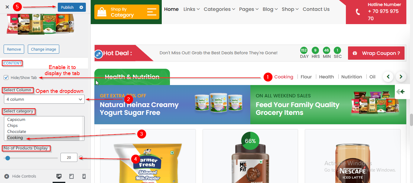 To manage the Filter Tab , Select Column , Select Category and No. of product display in Product Four Section, follow these steps: