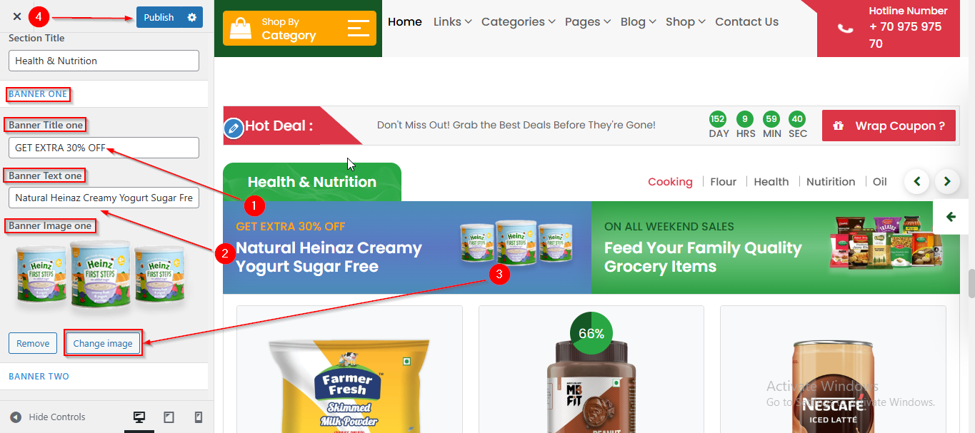- From here you can manage the Banner One Content such as Title , Text and Image.