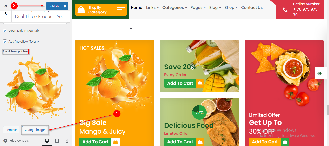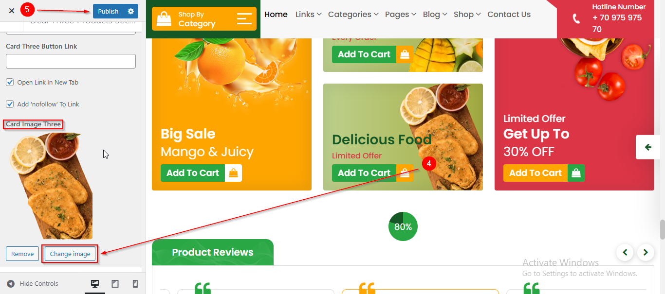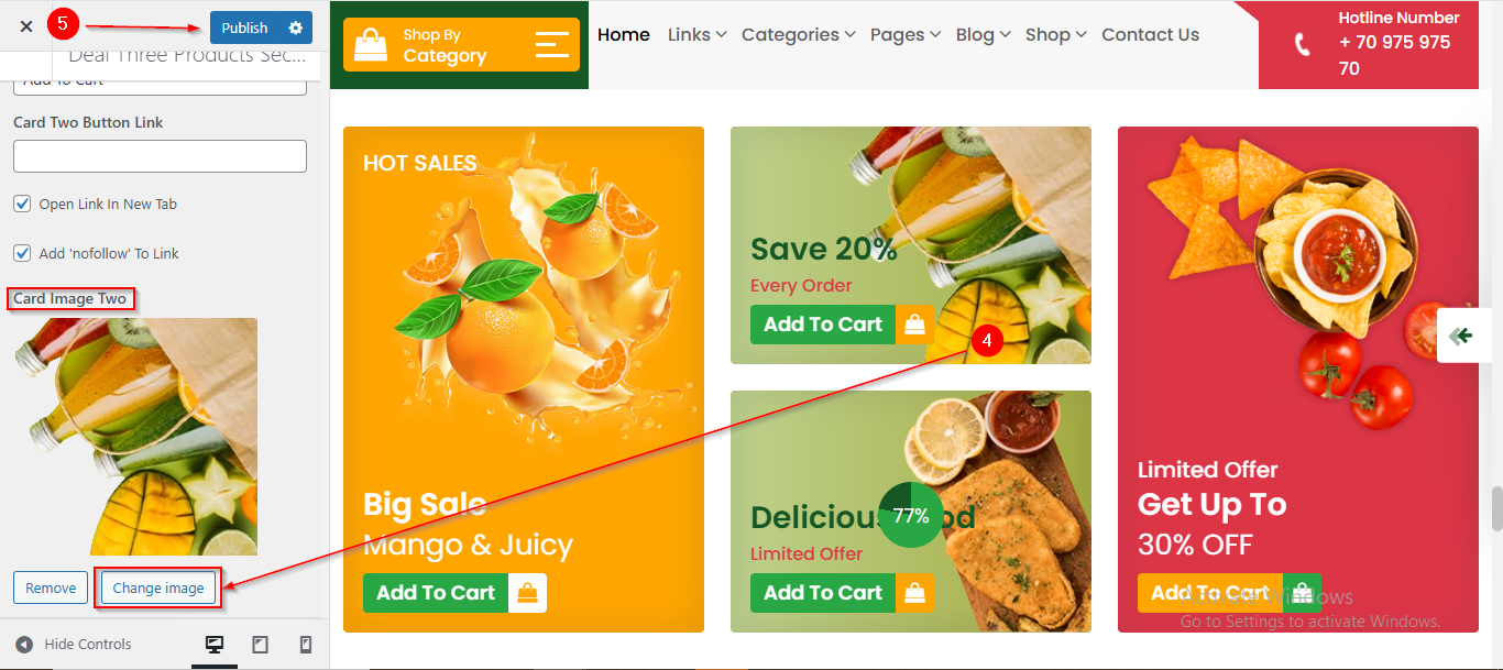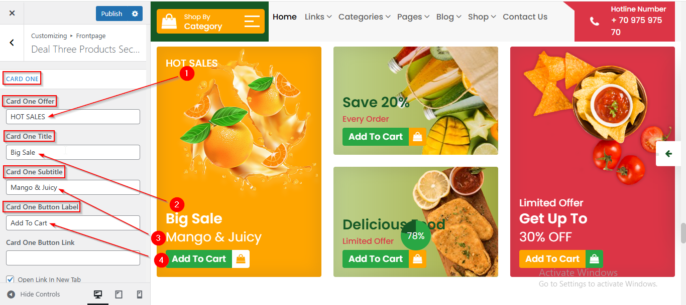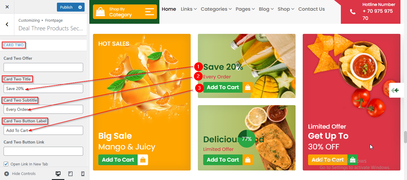 4. From the CARD THREE , you can manage the Offer , Title , Subtitle and Button.