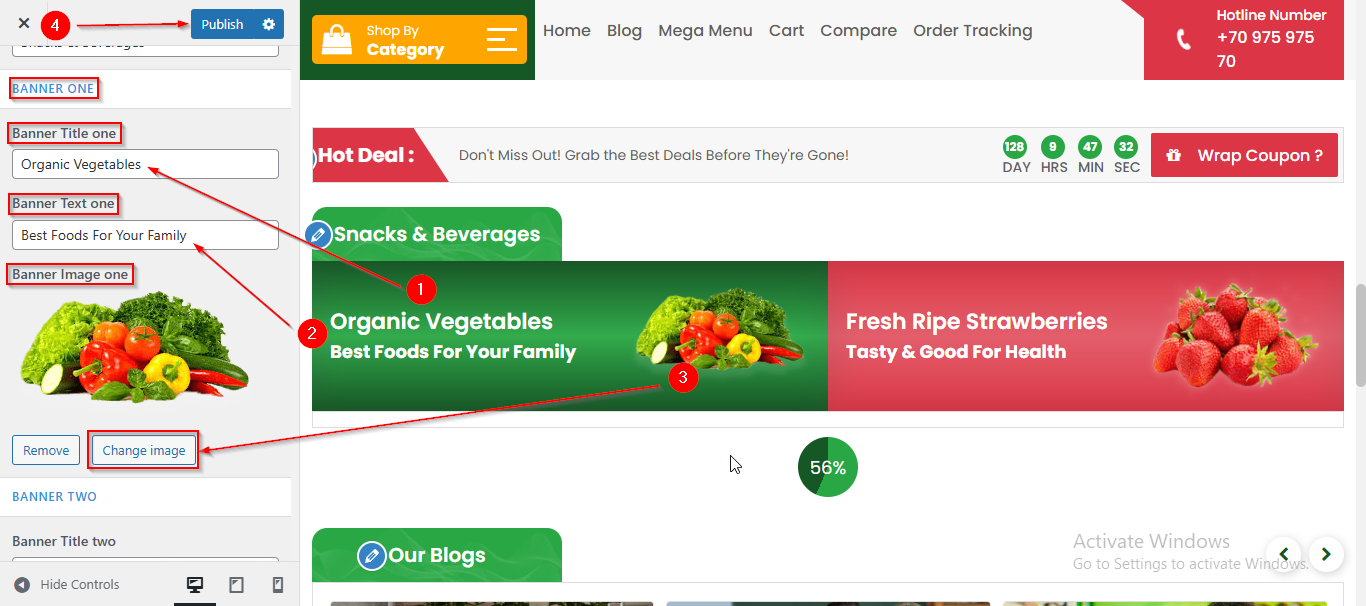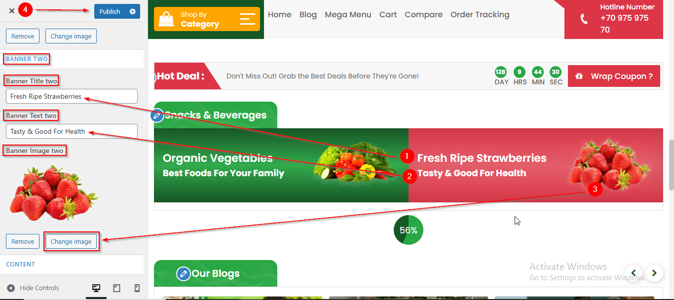 - From here you can manage the Banner One Content such as Title , Text and Image.