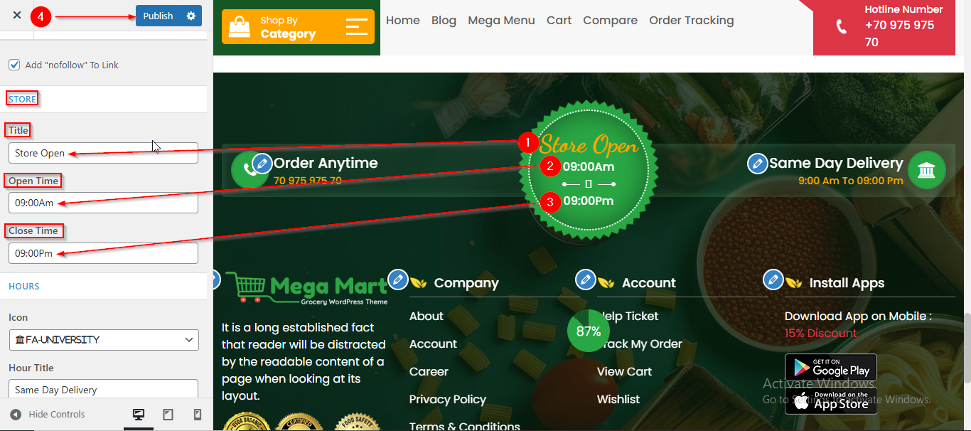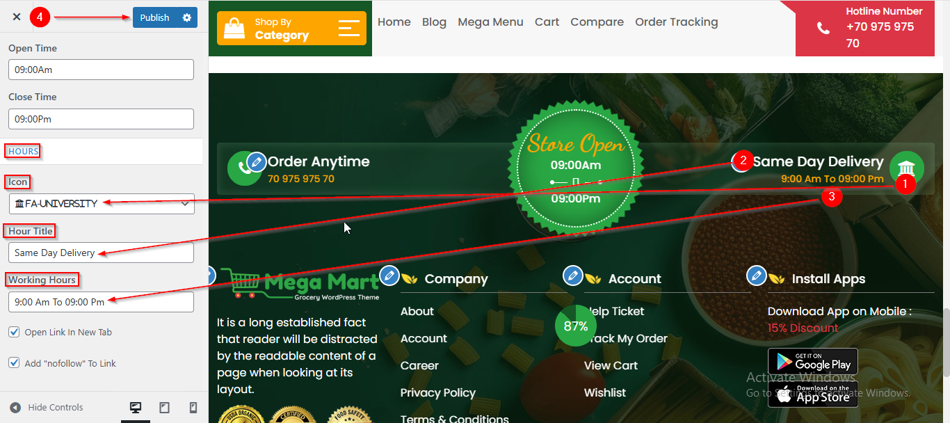 - From the HOURS section you can manage the Footer Contact 2 Content such as Icon , Hour , Working hours.