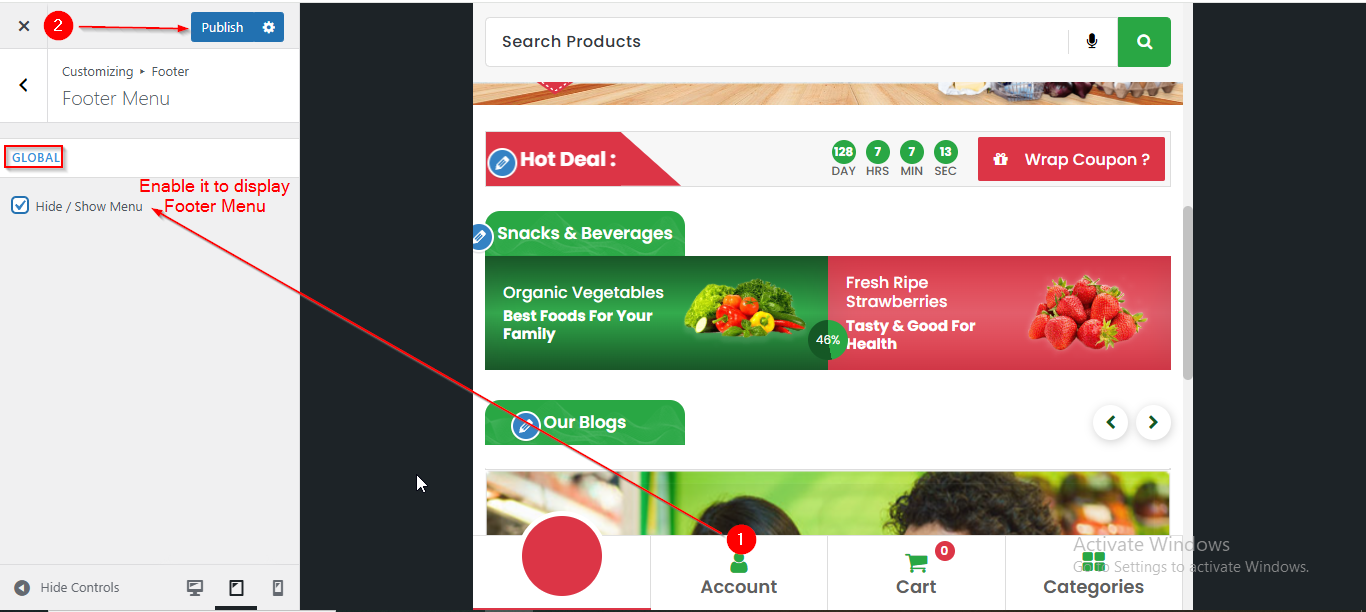 - Here, you have to enable the checkbox Hide/Show Menu from the GLOBAL Option to display the Footer Menu.