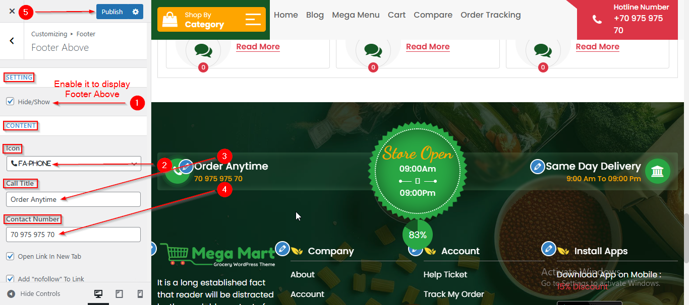 - From the CONTENT section you can manage the Footer Contact 1 Content such as Icon , Call Title and Contact Number.