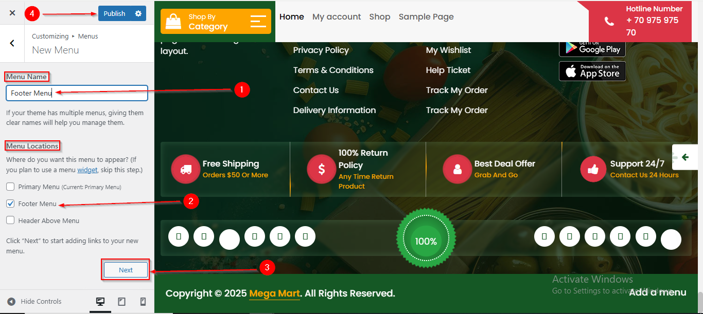 Note: Ensure you have checked the Footer Menu option. If you create your menu without enabling this checkbox, the menu will not appear in the Footer section.