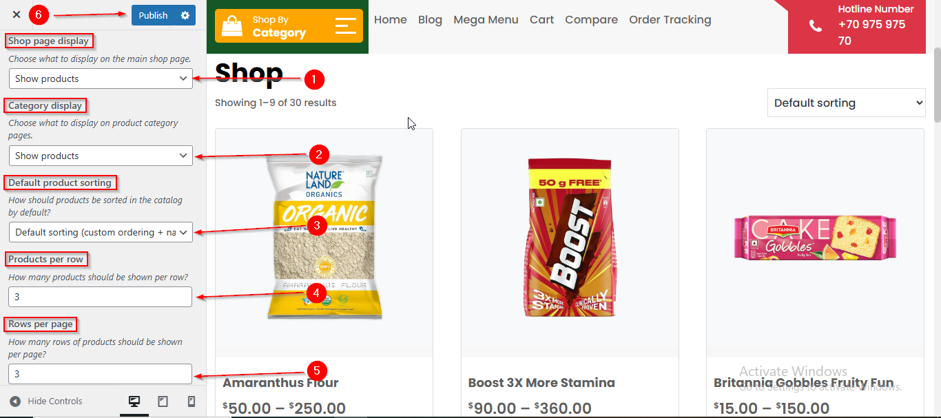 - Here, you can manage various Product settings such as what you want to display on the Shop page, what to show on the Product Category page, how you want products to be sorted, products per row, and rows per page.
