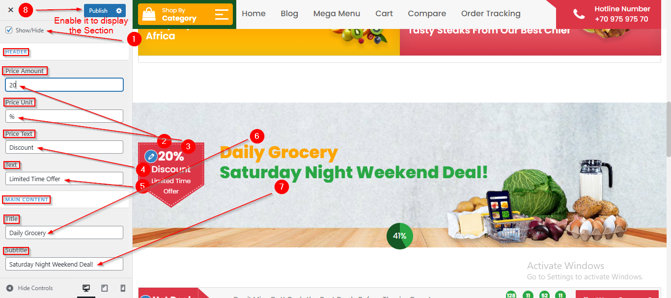 Note : Ensure the checkbox labeled Show/Hide is checked if you want to display the Banner Section.