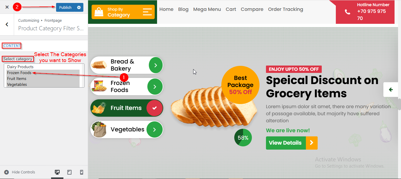 - On the Customizer page, go to Frontpage > Product Category Filter Section.